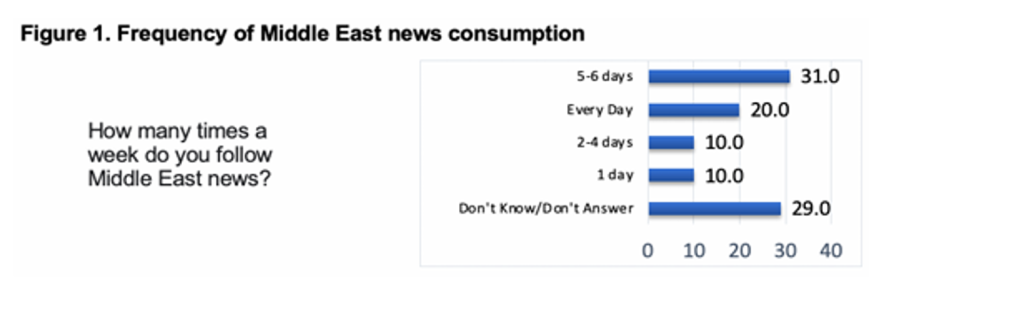 Temuan survei mengungkapkan bahwa persentase tinggi publik Indonesia adalah konsumen berita yang antusias mengenai Timur Tengah: 31% mengikuti berita 5-6 hari seminggu, 20% memantau berita setiap hari, sementara 10% memeriksa berita 2-4 hari seminggu, dan 10% hanya sekali seminggu (Gambar 1).