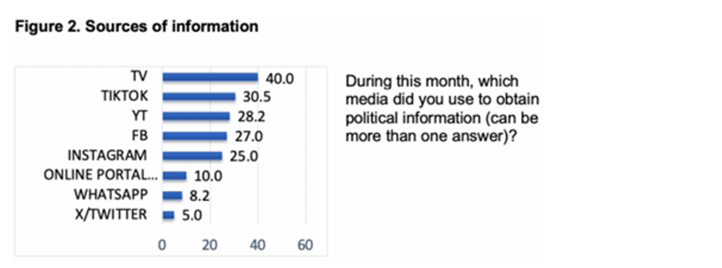 Mayoritas responden tampaknya mendapatkan informasi mereka dari media sosial: sementara 40% mengklaim memperoleh berita dari TV, 30,5% menyebut TikTok sebagai sumber berita mereka, 28,2% menyebut YouTube, 27% menyebut Facebook, dan 25% menyebut Instagram (Gambar 2).