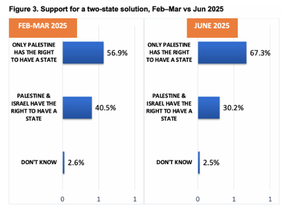 Namun, pada bulan Juni, terjadi penurunan sentimen publik: dukungan untuk solusi dua negara menyusut menjadi 30,2% hanya dalam waktu empat bulan.