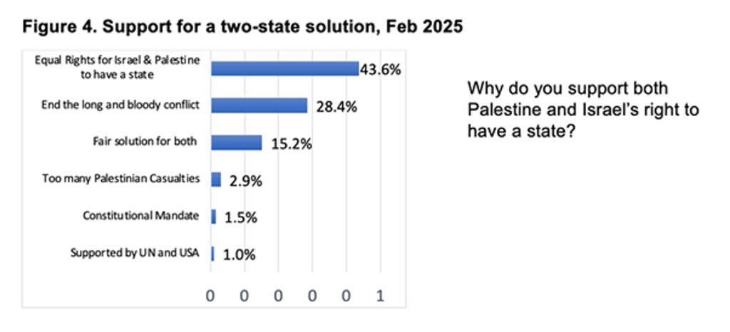 Survei bulan Februari menunjukkan bahwa sebagian masyarakat Indonesia tidak lagi terikat pada narasi anti-kolonialis saat memandang konflik Palestina-Israel, di mana Israel dianggap tidak memiliki hak atas tanah tersebut karena mereka adalah penjajah. Kelompok ini tampak cukup pragmatis untuk menerima solusi yang dapat mengakhiri konflik, bahkan jika itu berarti mengakui hak Israel untuk bernegara.