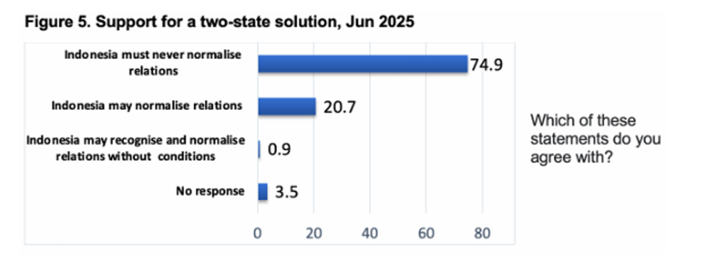 Temuan bulan Juni menunjukkan bahwa 74,9% akan memilih posisi bahwa Indonesia tidak boleh menormalisasi hubungan atau mengakui Israel, dengan hanya 20,7% yang menerima bahwa Indonesia dapat menormalisasi hubungan, dengan syarat tertentu (Gambar 5).