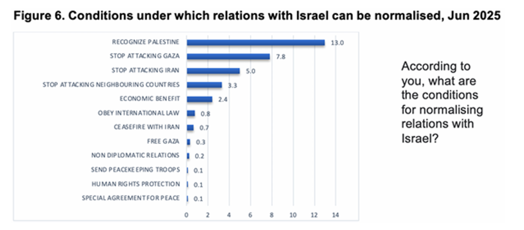 Lalu, mengapa ada penurunan dukungan untuk solusi dua negara dan normalisasi hubungan diplomatik Indonesia-Israel? Responden menunjuk pada babak konflik terbaru sebagai penyebabnya, dengan 7,8% responden menyerukan penghentian segera perang di Gaza, 5% menyebutkan perlunya Israel menghentikan serangan terhadap Iran, dan 3,3% menginginkan Israel berhenti menyerang negara-negara tetangganya (Gambar 6).