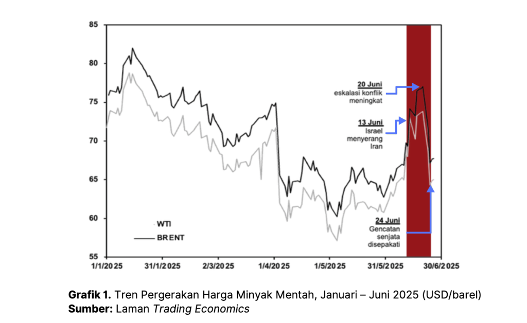 Jika penutupan selat benar-benar terjadi, pasar energi global akan mengalami supply shock yang tak dapat dikompensasi penuh oleh cadangan strategis IEA sebesar 1,2 miliar barel maupun pipa Saudi East-West yang hanya mampu menyalurkan 5 juta barel per hari. Proyeksi harga minyak Brent dalam skenario tersebut melonjak ke kisaran USD 100- 150 per barel, menciptakan tekanan inflasi global yang menyebar melalui rantai pasok. Grafik 1 menunjukkan harga minyak bergejolak ketika eskalasi perang meningkat sepanjang 13-24 Juni.