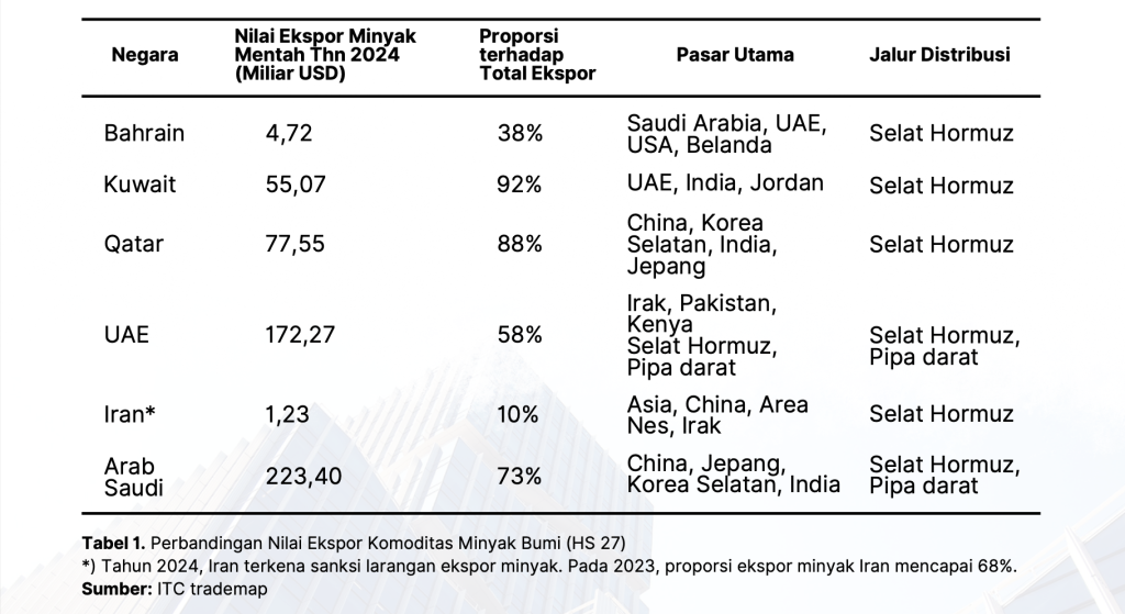 Tabel 1 menunjukkan beberapa negara berpotensi menghadapi tekanan perdagangan jika Selat Hormuz diblokade. Bahrain dengan nilai ekspor minyak US$ 4,72 miliar (38% dari total ekspor) cukup bergantung pada stabilitas perdagangan di selat ini. Kuwait menghadapi kerentanan ekstrem dengan ekspor minyak mencapai 92% (US$ 55,07 miliar) dari total ekspor dan sepenuhnya bergantung pada Selat Hormuz.