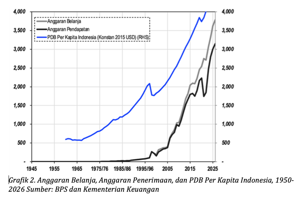 Belanja pemerintah yang meningkat rata-rata 27% selama 1961–2025 belum efektif meningkatkan kesejahteraan masyarakat, terbukti dari PDB per kapita yang hanya tumbuh 3,7%, tujuh kali lebih lambat dari kenaikan anggaran belanja.