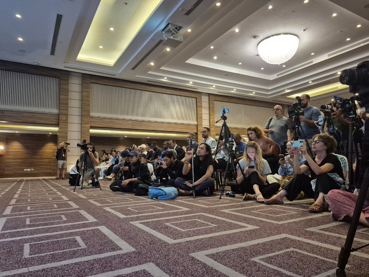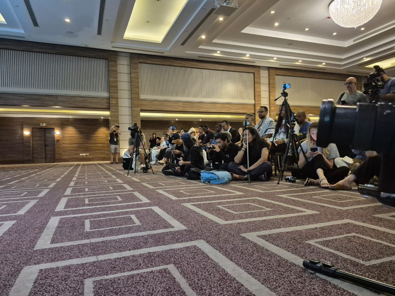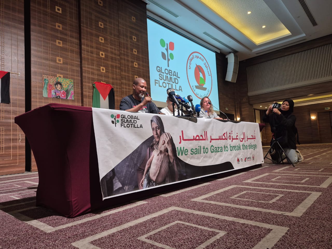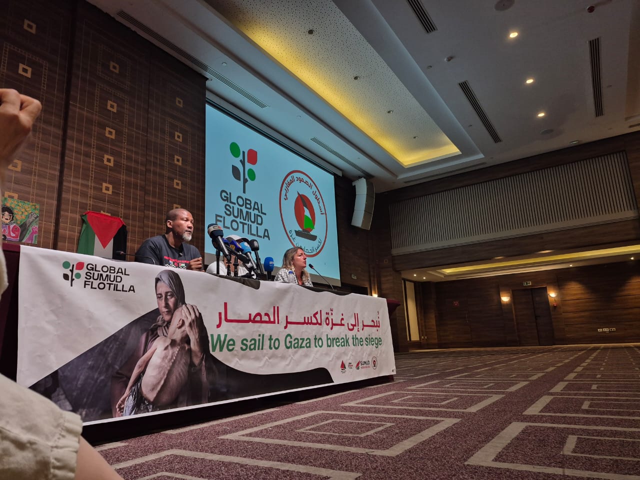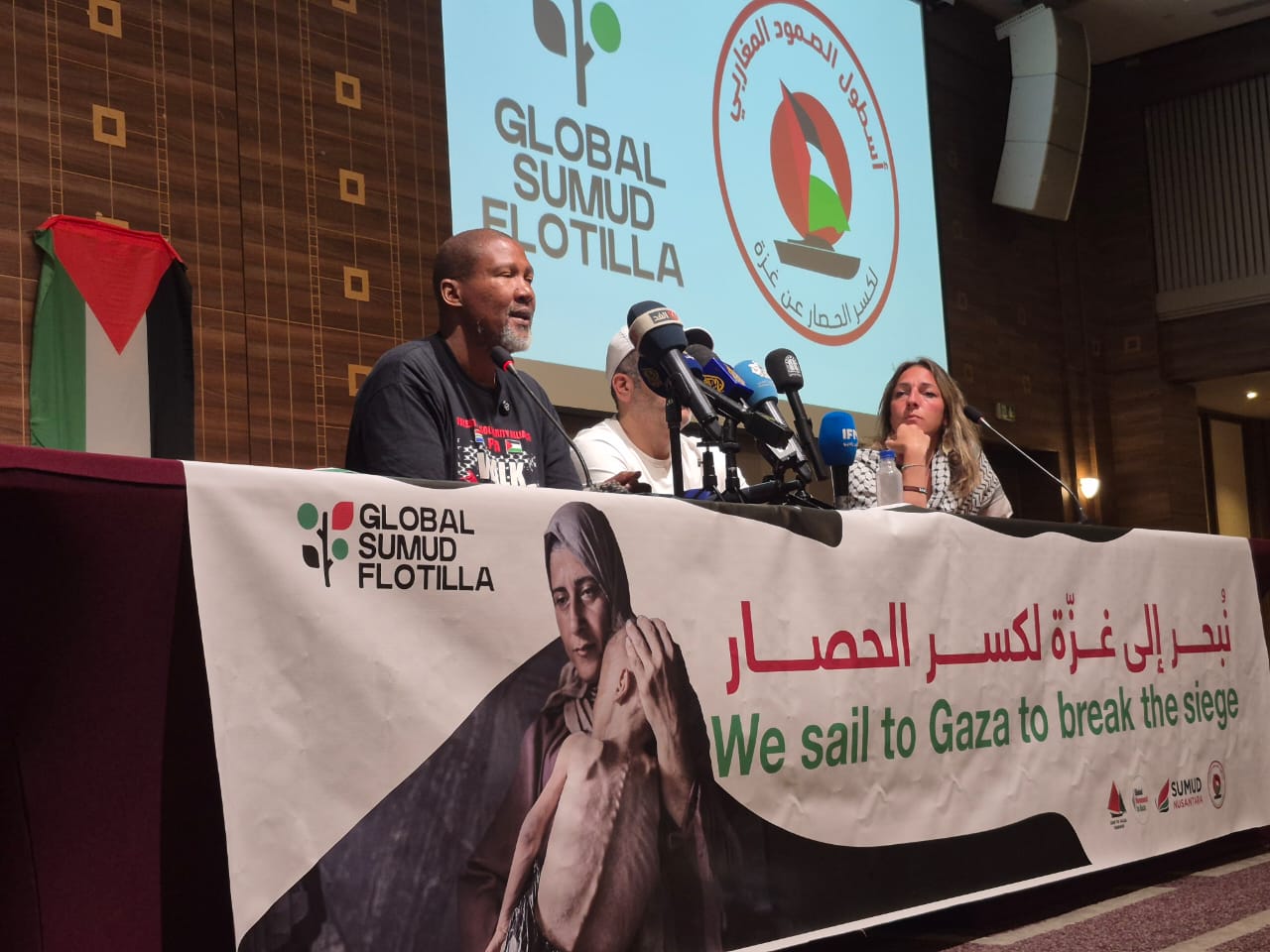 TUNIS – Mandla Mandela, cucu tokoh pejuang Afrika Selatan Nelson Mandela, turut hadir dalam pertemuan relawan Global Sumud Flotilla (GSF) di Hotel Radisson Blu, Tunis, Tunisia pada Jumat (5/9/2025). Dalam pertemuan ini Mandla menyemangati para relawan agar menguatkan tekad dalam membela Palestina dan menghentikan blokade atas Gaza. Mandla juga berjanji akan turut berlayar bersama GSF. (Foto: Chairul Akhmad)