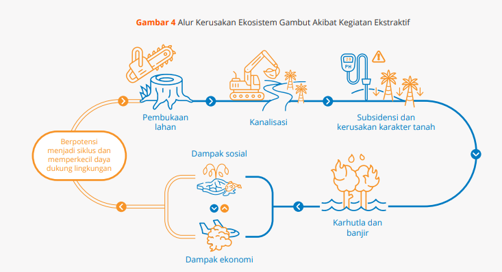 Ancaman eksploitasi oleh perusahaan masih terus mengancam ekosistem gambut. Dampaknya bukan hanya pada ekosistem di dalamnya, tetapi juga meluas ke kehidupan masyarakat yang bahkan tidak bersinggungan langsung.3 Mereka akan merasakan banjir berkepanjangan saat musim hujan, sementara asap karhutla tinggal menunggu giliran untuk muncul saat kemarau tiba. Masalah ini sering terjadi di beberapa daerah di Indonesia seperti Kabupaten Kapuas dan Kabupaten Pulang Pisau, Provinsi Kalimantan Tengah, serta Kabupaten Ogan Komering Ilir, Provinsi Sumatera Selatan..