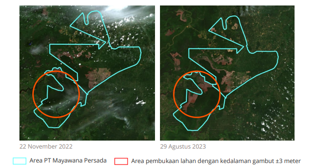10 Pantau gambut menilai bahwa kerusakan lahan gambut akibat pengeringan di area konsesi sangat mengkhawatirkan. Banyak lahan gambut, terutama di Regional Sumatera dan Kalimantan, telah dibuka dan dikeringkan melalui pembangunan kanal. Contoh terbaru terjadi pada 2023-2024 ketika perusahaan PBPH PT Mayawana Persada di Kalimantan Barat, melakukan deforestasi dan pengeringan lahan lewat kanalisasi untuk mengubahnya perkebunan monokultur.11 Ironisnya, lokasi ini merupakan habitat orangutan dan satwa endemik Kalimatan lainnya yang kini terancam.