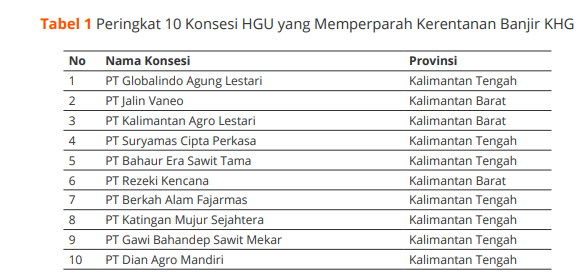Ketiganya memiliki sejarah panjang dalam ekspansi perkebunan sawit di lahan gambut. Praktik-praktik perusahaan ini melemahkan fungsi alami gambut sebagai penyerap dan penyimpan air, menjadikannya semakin rawan terhadap bencana hidrometeorologi, khususnya banjir. Tabel 1 Peringkat 10 Konsesi.
