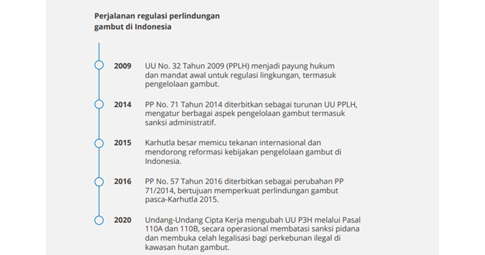 Padahal, Pasal 17 Ayat (2) UU P3H telah mengatur sanksi pidana untuk kegiatan perkebunan tanpa izin di dalam kawasan hutan. Walaupun UU Cipta Kerja tidak menghapus sanksi pidana ini secara formal, kehadiran Pasal 110A dan 110B secara operasional membatasi keberlakuan materiil sanksi pidana tersebut. Hal ini akhirnya menciptakan permasalahan baru yang merugikan lanskap ekosistem gambut.