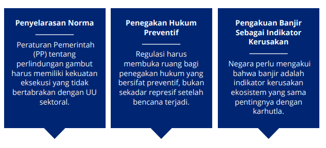 Kebijakan untuk menjamin keberlanjutan ekosistem gambut dan mencegah eskalasi bencana ekologis seperti banjir dan kebakaran, pendekatan politik hukum harus direvisi secara menyeluruh. Hal ini penting untuk dilakukan dengan: