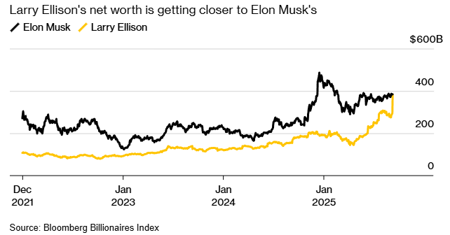 Ellison (81), yang kini menjabat sebagai chairman dan chief technology officer Oracle, memiliki sebagian besar kekayaannya yang terikat pada saham perusahaan yang ia dirikan tersebut. Sementara itu, Musk (54), telah memegang predikat orang terkaya di dunia selama lebih dari 300 hari setelah merebutnya kembali tahun lalu dari Bernard Arnault dan Jeff Bezos.