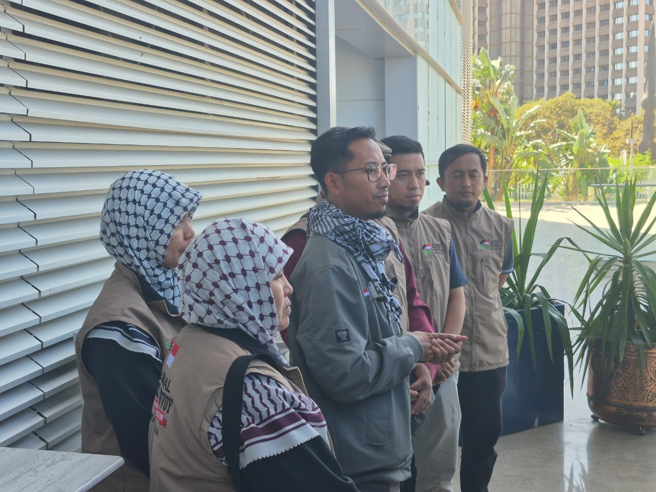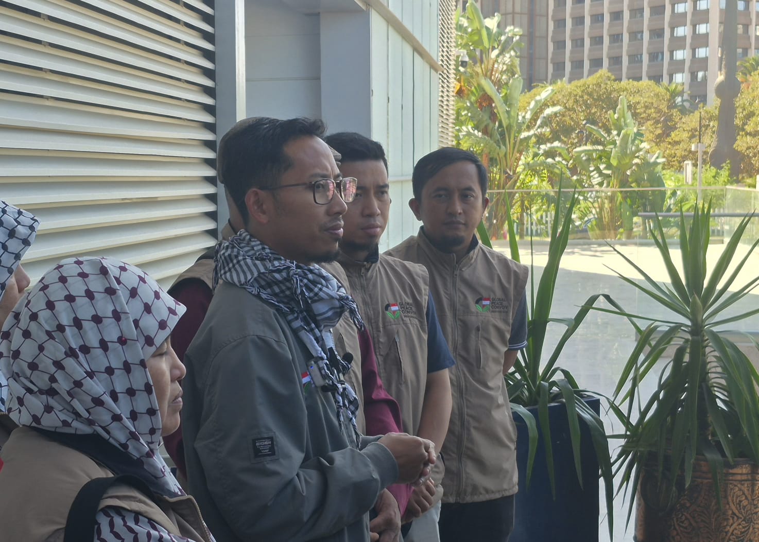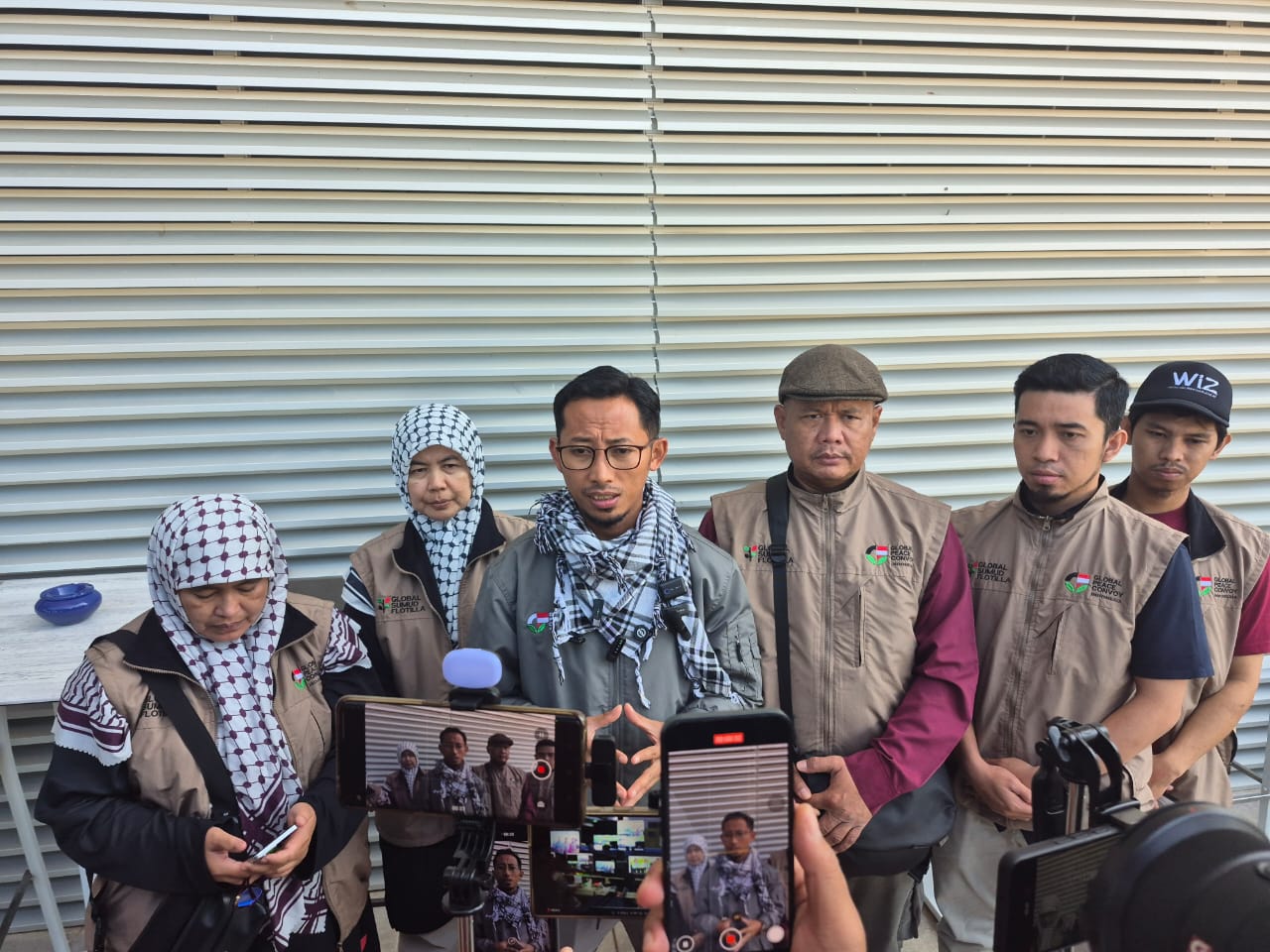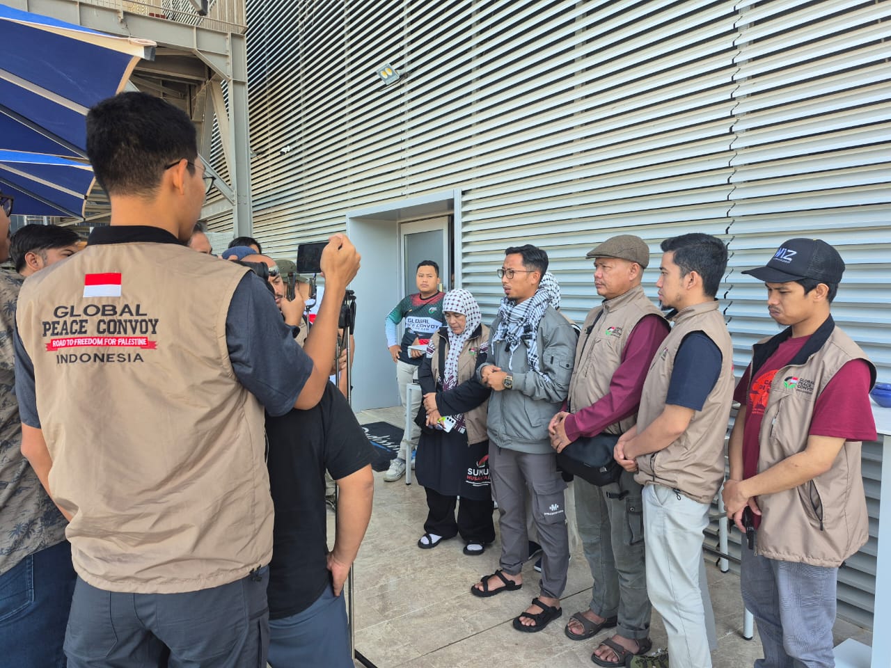 TUNIS – Delegasi Indonesia Global Peace Convoy (IGPC) memutuskan untuk menarik diri dari misi pelayaran Global Sumud Flotilla (GSF) menuju Jalur Gaza. Hal ini ditegaskan oleh Koordinator IGPC, Muhammad Husein, dalam konperensi pers di Hotel Radisson Blu, Tunis, pada Jumat (12/9/2025). Husein mengatakan relawan Indonesia yang tergabung dalam IGPC memutuskan tidak ikut berlayar karena sejumlah faktor, di antaranya banyak kapal yang rusak, ketersediaan kursi di kapal yang terbatas, dan masalah-masalah teknis lainnya. (Foto: Chairul Akhmad)