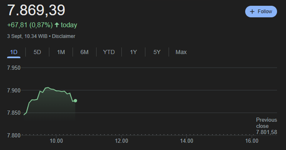 Pada penutupan perdagangan Selasa (2/9), IHSG berhasil menguat 0,85 persen atau 66,52 poin ke level 7.801,59. Total nilai transaksi tercatat mencapai Rp16,38 triliun dengan 576 saham menguat, 126 saham melemah, dan 101 saham stagnan.