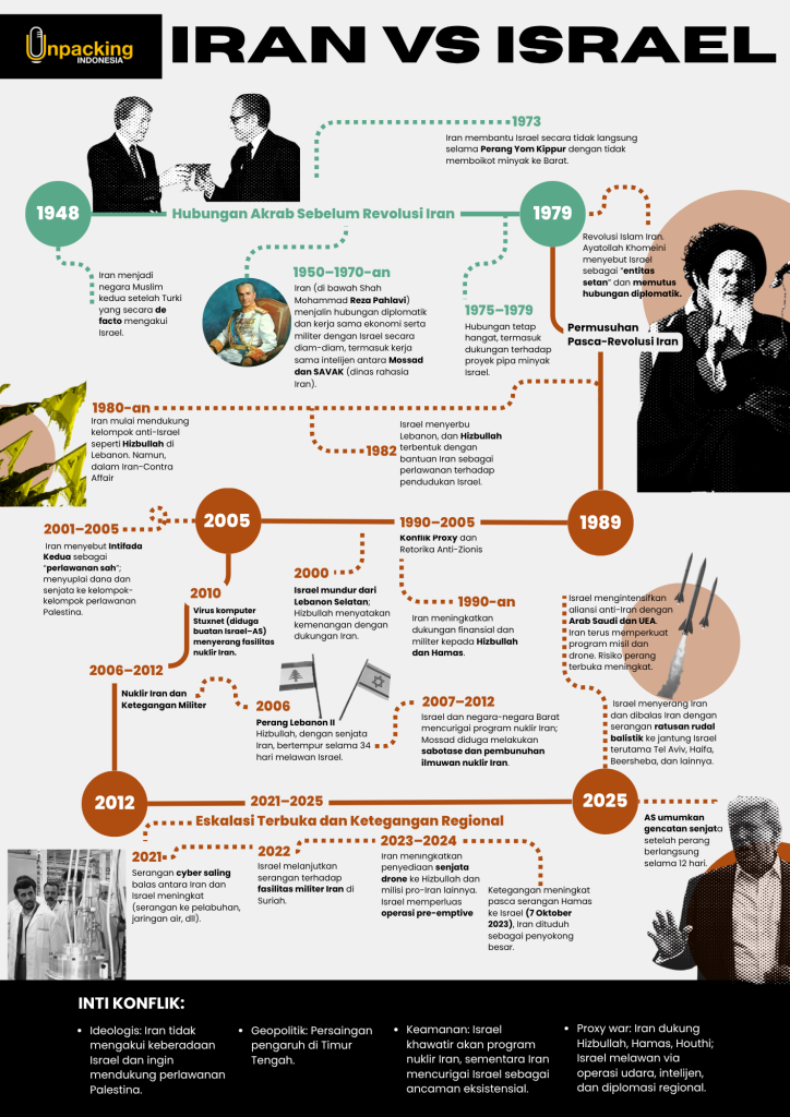 Home > Infografi 104 views 2 secs 0 comments Israel vs Iran dalam Linimasa In Infografi June 29, 2025 Ilustrasi. (Foto: Thesecretariat) Pasang surut hubungan dua negara