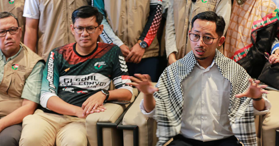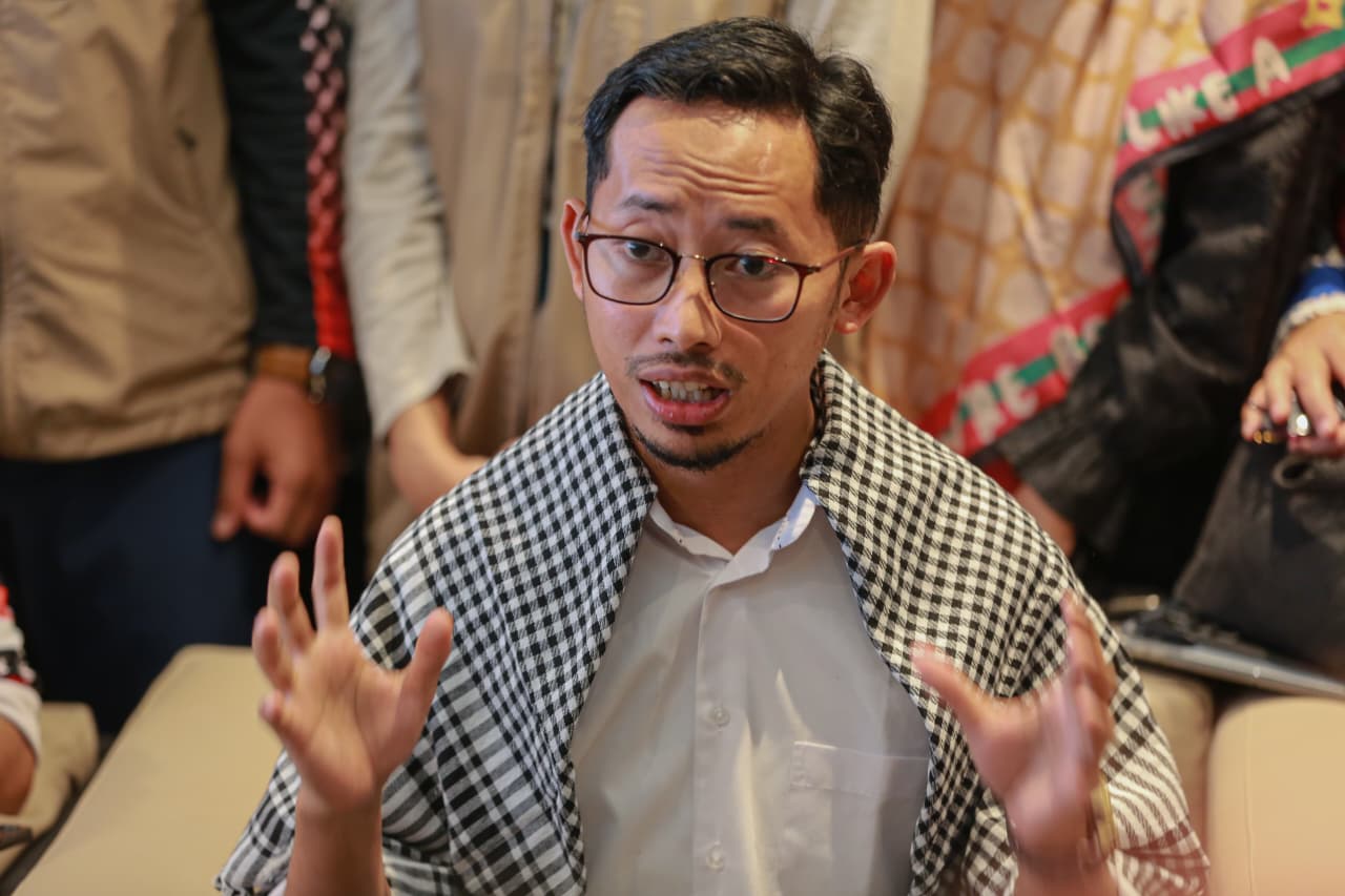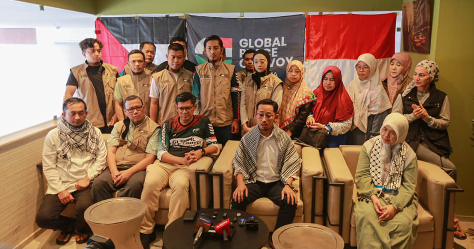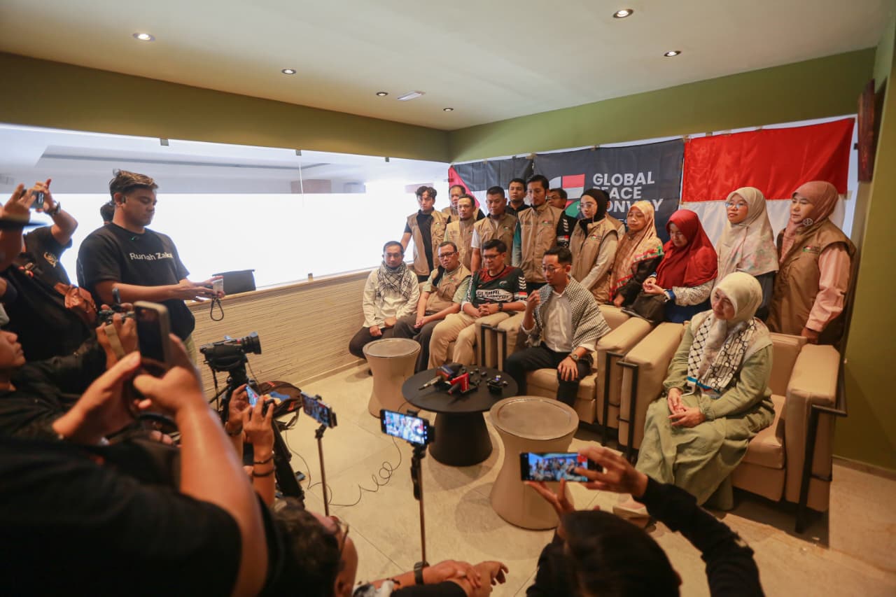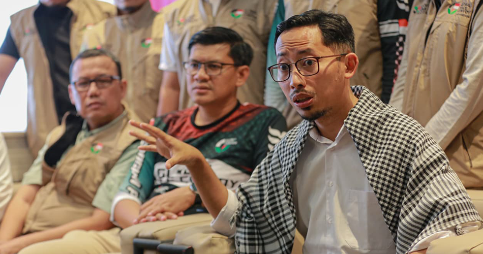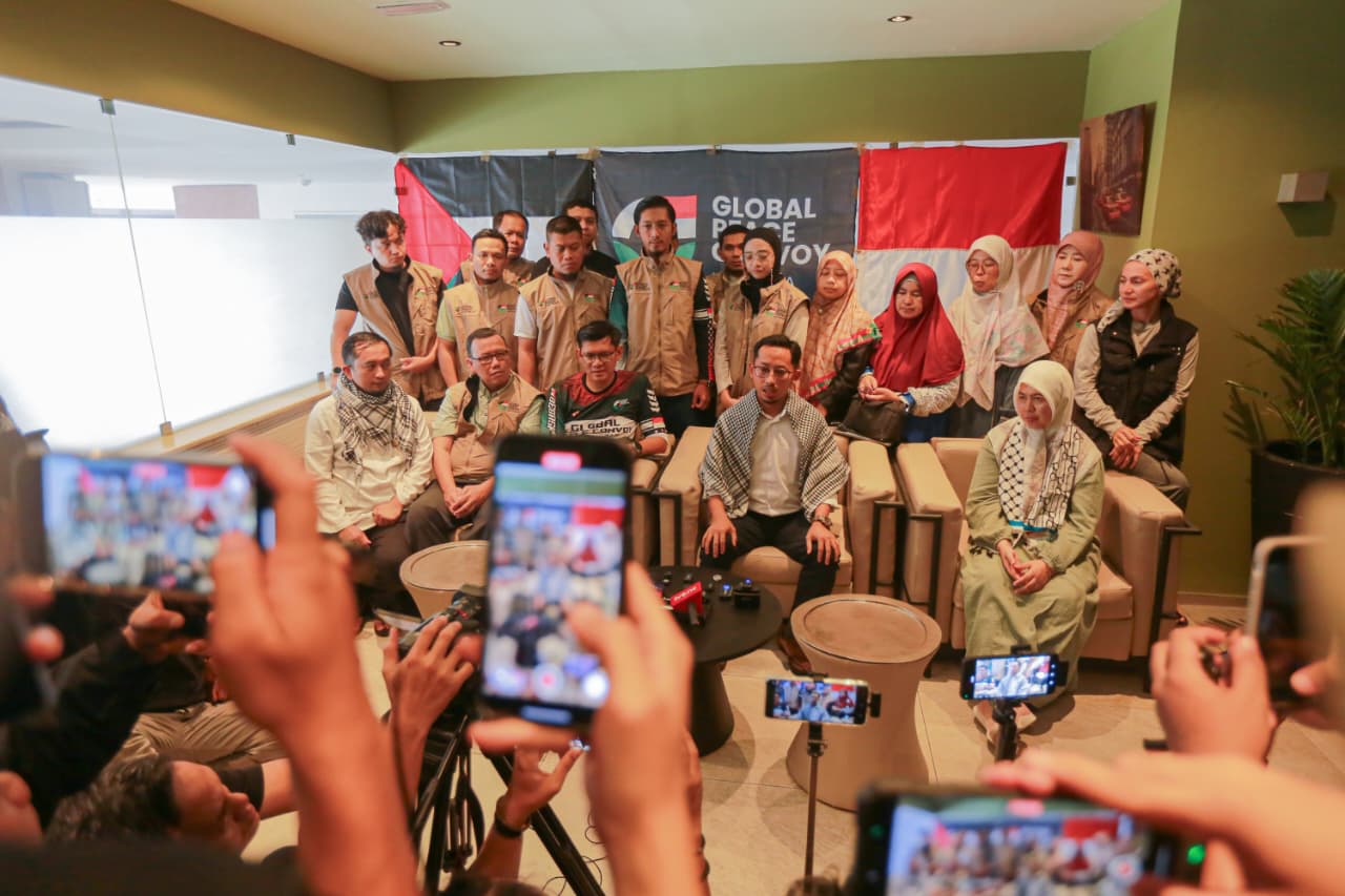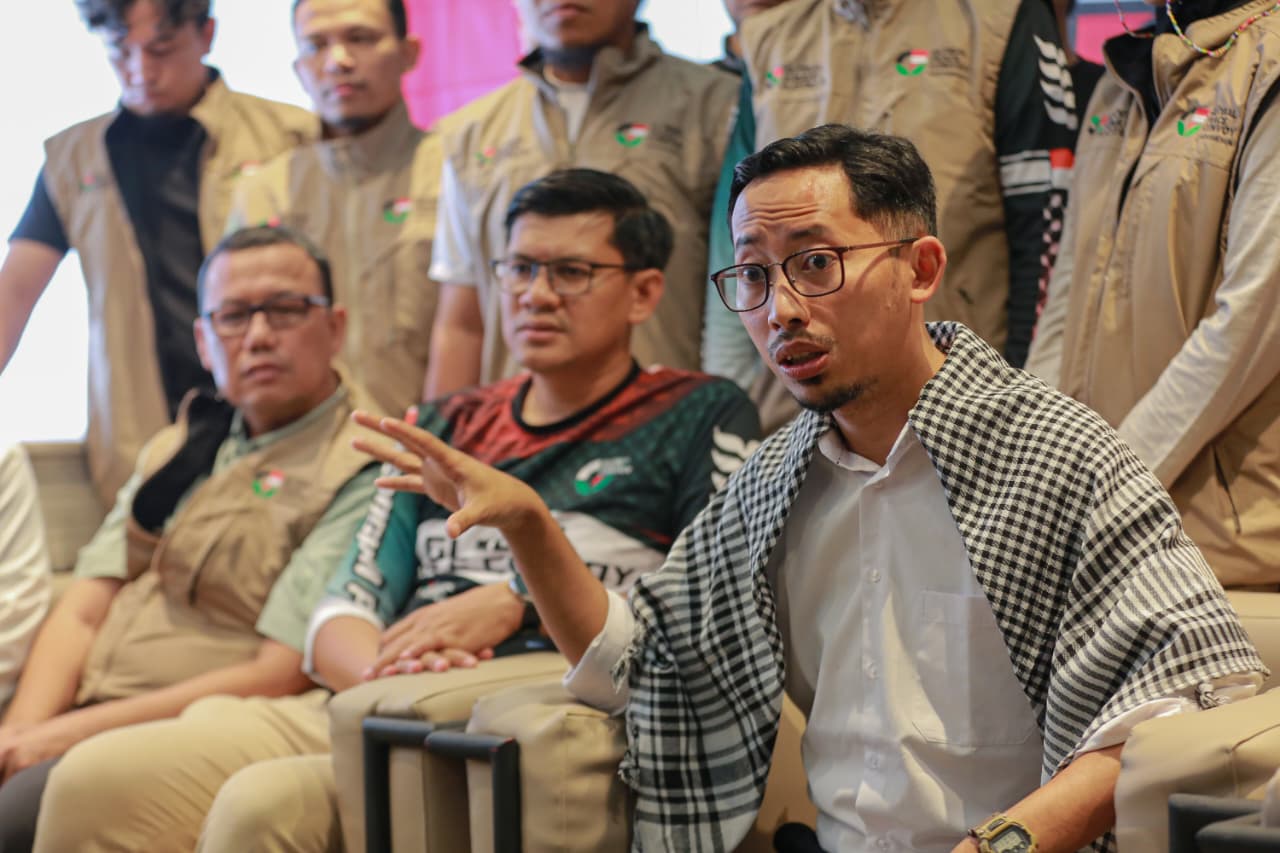 Ketua Kordinator Indonesia Global Peace Convoy (IGPC) Muhammad Husein menyampaikan keterangan pers terkait keberangkatan delegasi Indonesia dalam misi kemanusiaan untuk Palestina bersama Global Sumud Flotilla di Tunisia, Kamis (4/9/2025). Dalam keterangan persnya, Delegasi Indonesia menyumbangkan lima kapal yang diberi nama-nama pahlawan yakni Soekarno, kapal Diponegoro, Malahayati, Kapal Pati Unus dan Kapal Hasanudin. Sementara untuk jadwal pelayaran dari awalnya tanggal 6 September diundur pada Ahad, 7 September mendatang. (Foto: Chairul Akhmad)