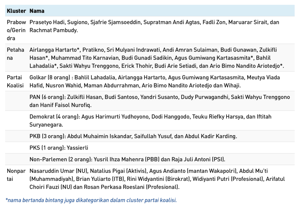 Secara umum, kabinet Prabowo dapat dibagi dalam empat kluster utama: