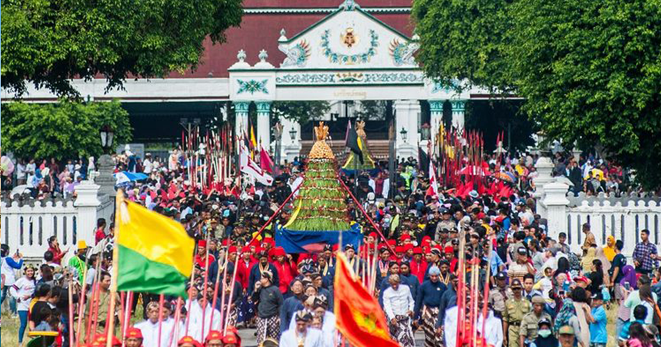 Di jantung kebudayaan Jawa, Keraton Yogyakarta dan Surakarta menggelar tradisi Grebeg Maulud. Puncak dari perayaan ini adalah kirab gunungan—tumpukan raksasa berisi hasil bumi dan aneka makanan—yang diarak dari keraton menuju masjid agung. Ribuan warga kemudian akan berebut isi gunungan tersebut, yang dipercaya membawa berkah dan kemakmuran.