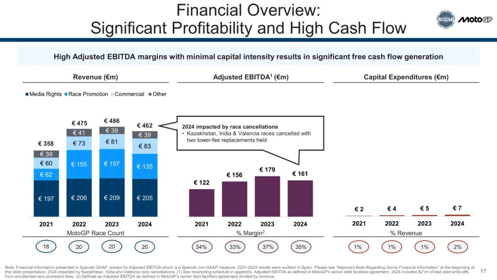 Dalam empat tahun terakhir, MotoGP berhasil mempertahankan pendapatan tahunan di atas €460 juta, dengan EBITDA (Earnings Before Interest, Taxes, Depreciation, and Amortization) yang konsisten tinggi. Meskipun pada tahun 2024 terjadi pembatalan tiga balapan (di Kazakhstan, India, dan Valencia), margin EBITDA tetap bertahan di atas 34%.