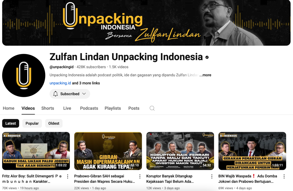 Podcast Unpacking Indonesia, yang dipandu oleh Zulfan Lindan, adalah wadah diskusi politik yang mengundang berbagai tokoh dan analis untuk membahas isu-isu terkini secara mendalam. Podcast ini menghadirkan pembicara beragam seperti Hasan Nasbi, M. Qodari, Adi Prayitno, dan Eros Djarot.