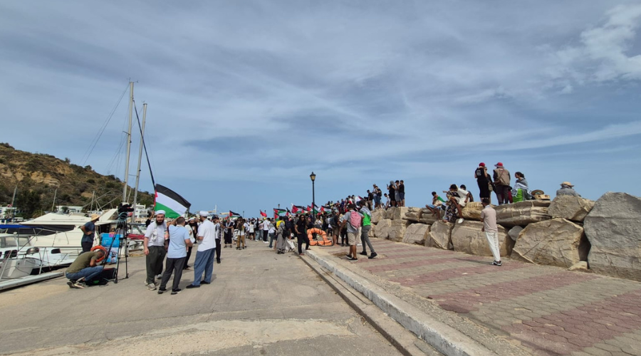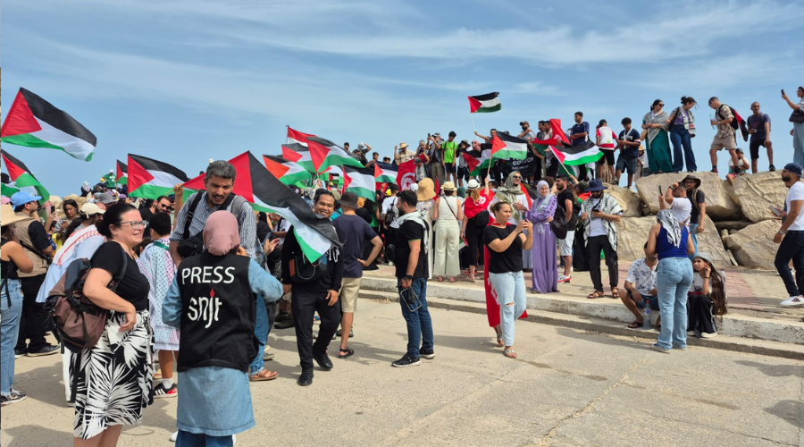 Sejumlah aktivis dan warga Tunisia yang peduli Gaza sempat menggelar unjuk rasa di pelabuhan. Mereka meneriakkan yel-yel bernada pembelaan terhadap Palestina dan Gaza.