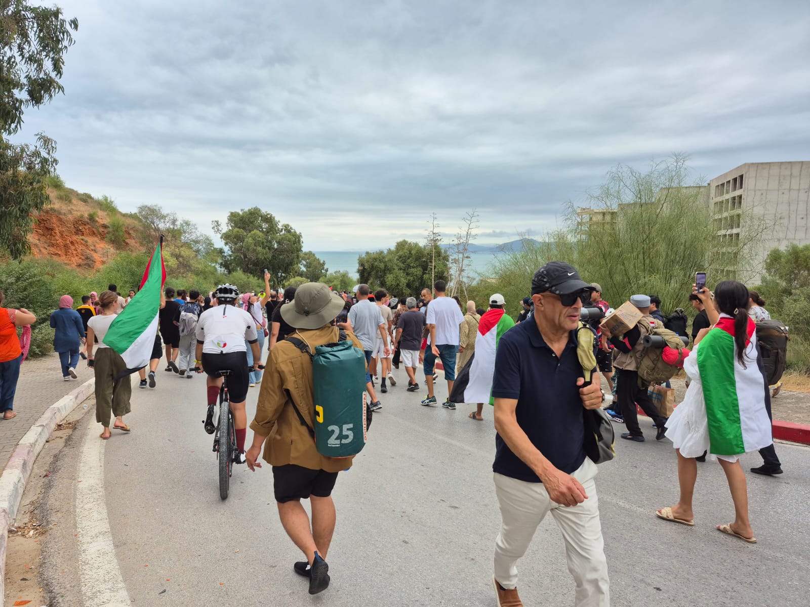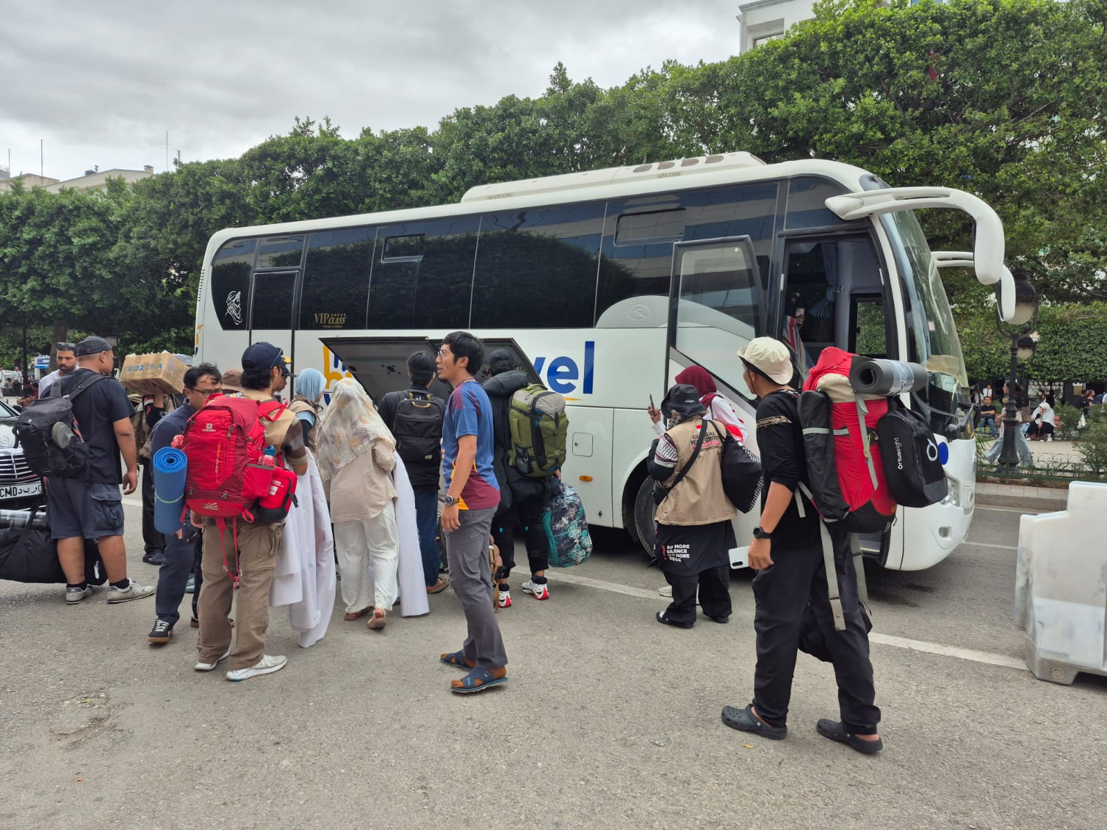 TUNIS – Relawan Indonesia Global Peace Convoy (IGPC) berangkat menuju Pelabuhan Sidi Bou Said dan akan berlayar ke Gaza pada Rabu (10/9/2025). Selain IGPC, relawan Global Sumud Flotilla (GSF) juga berangkat ke pelabuhan pada hari yang sama. Ratusan ribu warga Tunis menyambut para relawan yang akan berlayar untuk membuka koridor kemanusiaan di Jalur Gaza tersebut. (Foto: Chairul Akhmad)