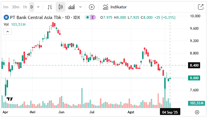 Dalam riset terbarunya yang dikutip pada akhir pekan lalu, Sabtu (6/9/2025), CLSA mempertahankan rekomendasi outperform untuk saham BBCA dengan target harga Rp 12.100. Target tersebut mencerminkan potensi kenaikan sebesar 51,25% dari posisi harga saat ini di level Rp 8.000 per saham.